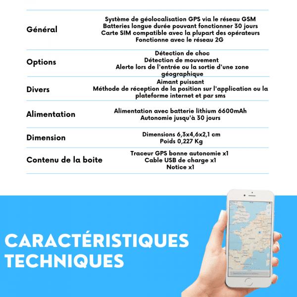 Le Traceur GPS 3G/4G Longue autonomie est un traceur GPS/GSM professionnel conçu pour le suivi en temps réel de véhicules, équipements ou personnes, sans besoin d’application ni de plateforme payante. Il utilise la technologie GSM 2G (compatible avec les cartes SIM 3G/4G prenant en charge la 2G) et peut être localisé par SMS ou appel téléphonique. Grâce à sa batterie 6000 mAh, son aimant puissant et son boîtier étanche IP56, ce tracker s’installe facilement sur tout type de véhicule et fonctionne jusqu’à 50 jours en veille.